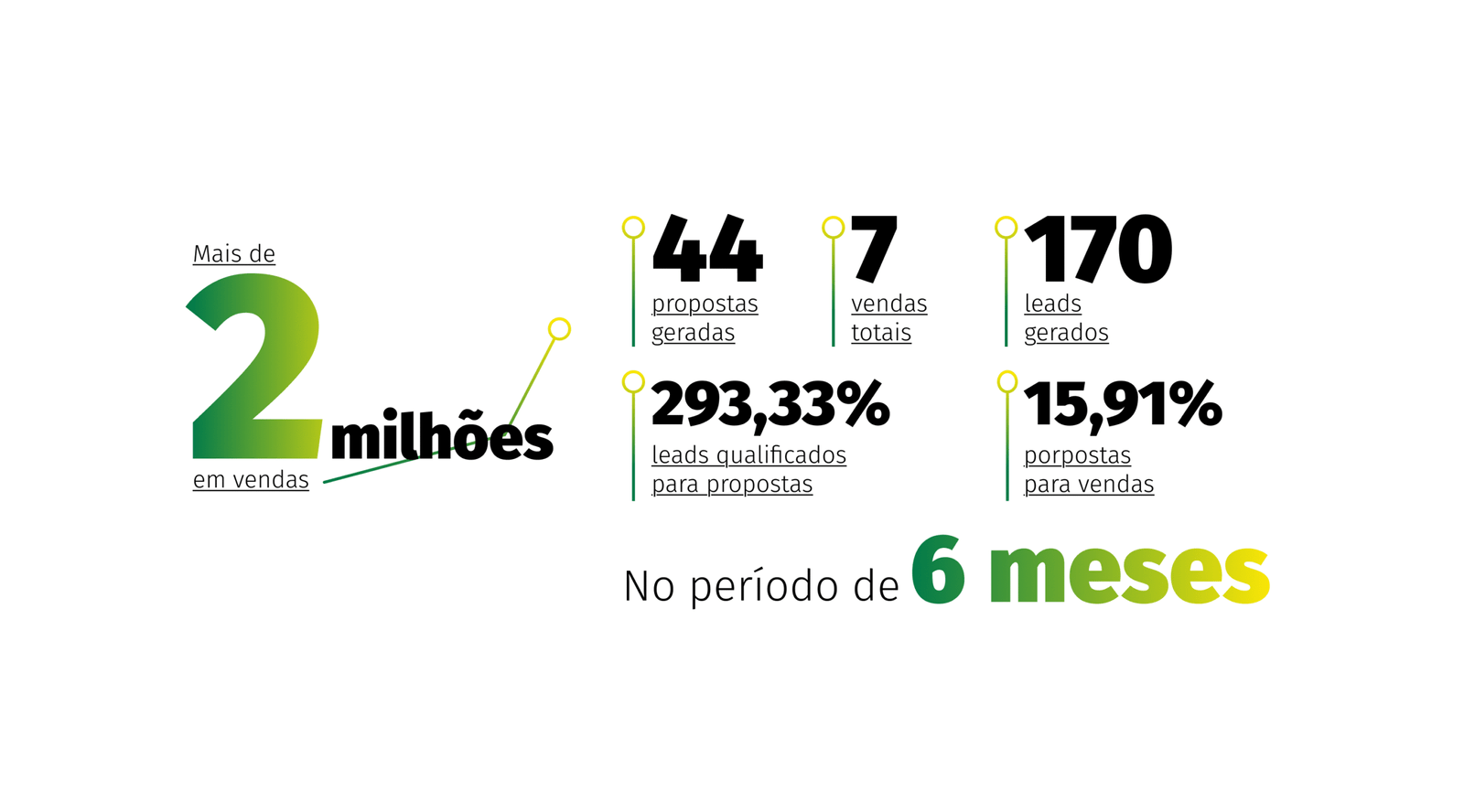 A implementação da estratégia de Inbound Marketing com foco em tráfego pago pela agência Mutum gerou resultados expressivos em apenas seis meses. Foram 170 leads gerados, 15 leads qualificados, 44 propostas comerciais e 7 vendas concluídas, representando mais de R$ 2 milhões em negócios.